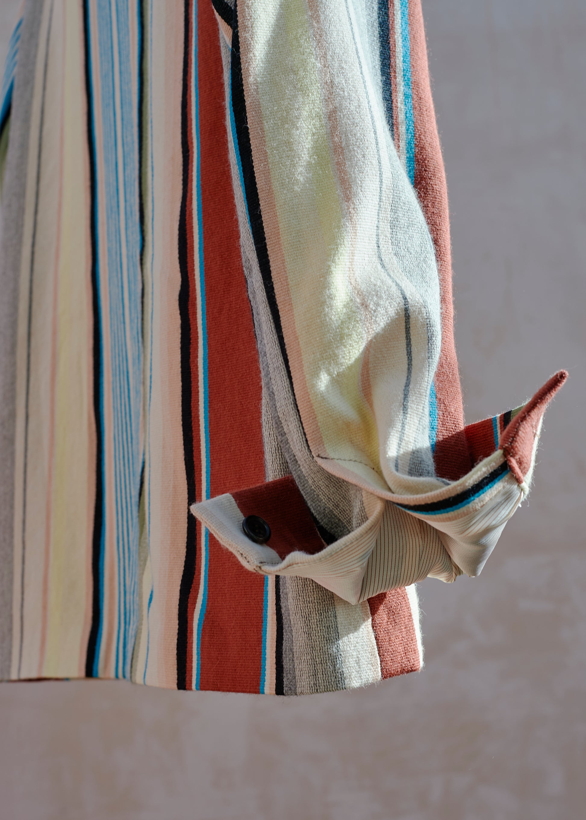The beautiful multicoloured stripes are the first thing you notice, this wonderful fabric would not look out of place in the southern states of America, or Mexico. The colours have a lovely depth and whilst all quite vivid, they work beautifully together. The wool/cotton makeup has a loose weave that helps creates a wonderfully soft, fuzzy texture. Each jacket made will be one-of-a-kind as they'll each have a slightly different arrangement of stripes, such is the nature of the material. Try styling this with simple staples and let the stripes shine, go for a real maximalist look, or simply enjoy the comfort of this jacket as a housecoat with loungewear.